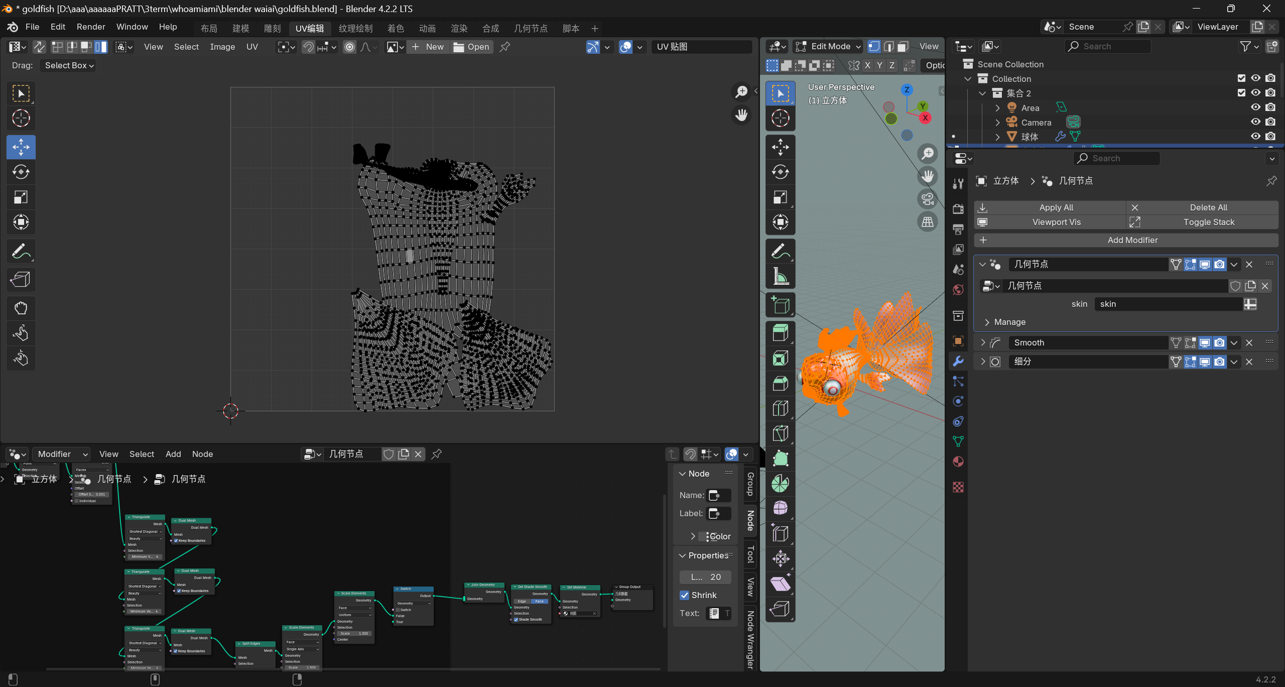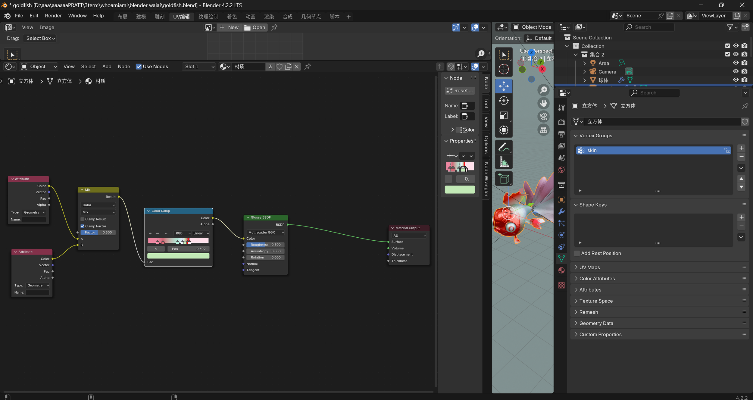 The UV map looks messy because I haven’t fully figured out how the color ramp node works. I know it’s a gradient, but it’s not just a simple left-to-right or top-to-bottom thing. If I set them normally, I get obvious color lines on body. So, to get the goldfish’s color spots what I want.