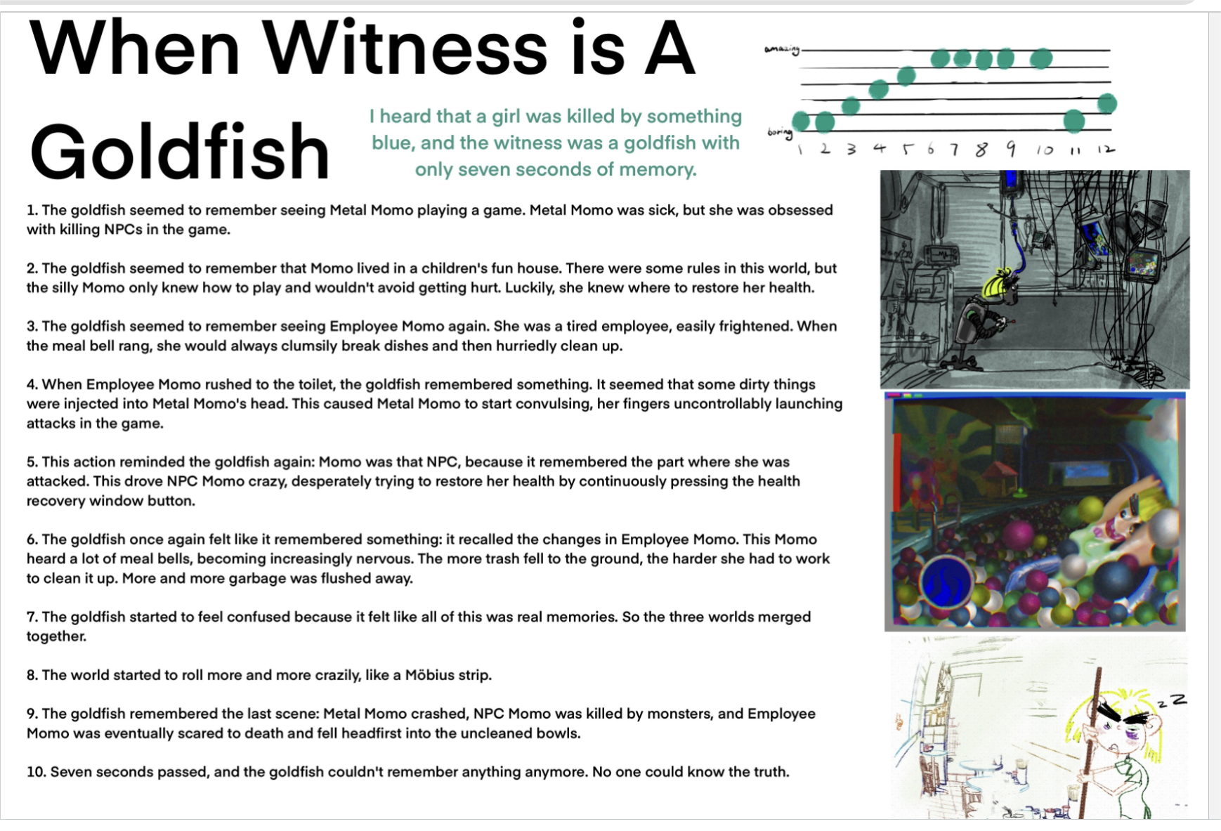 People heard a girl with thick eyebrows was killed by something in blue, but the only witness is a goldfish with a attention problem that it can't focus on sth more than 7 seconds…